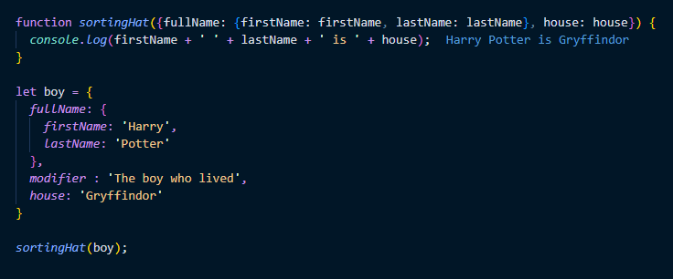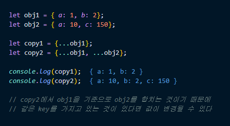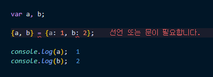 * 객체에서 구조 분해 할당 사용시 선언(const, let, var)와 함께 사용하지 않으면 에러가 발생할 수 있다.