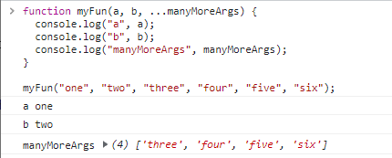 rest문법은 파라미터를 배열의 형태로 받아오기 때문에 manyMoreArgs가 위 이미지의 내용과 같은 형태로 출력된다.