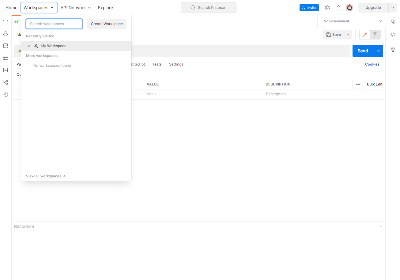 Postman 에 들어가 회원가입을 하고 프로그램을 설치하고 [Workspaces] - [My Workspace]로 이동한다.