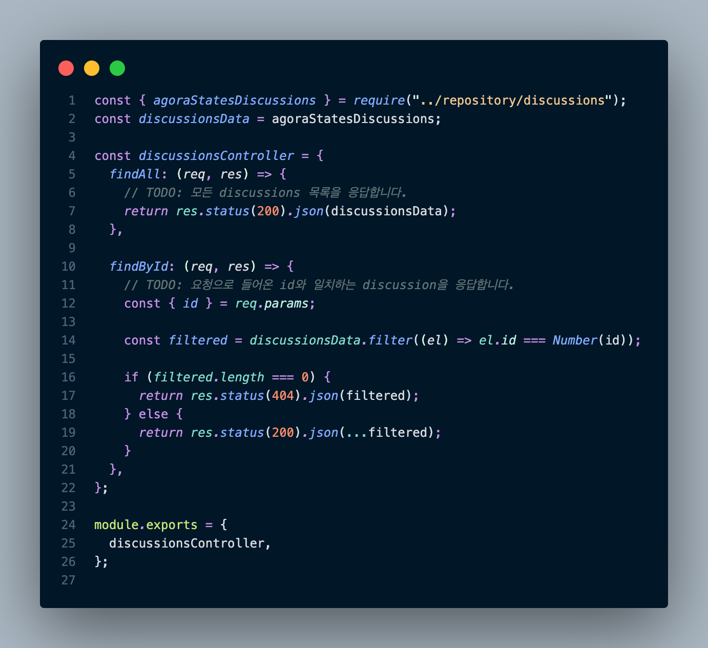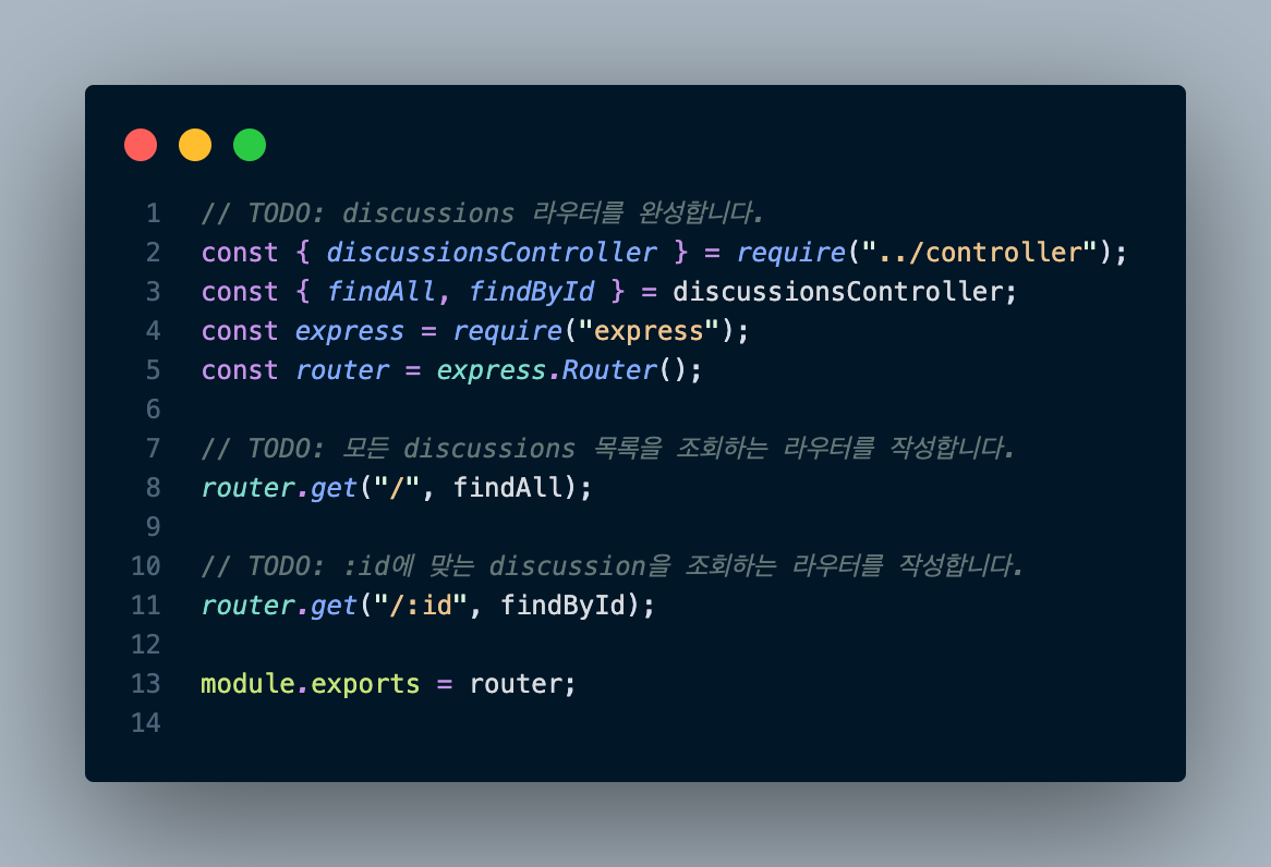 라우터를 불러온 다음 원하는 요청과 경로에 실행할 메서드를 지정해준다. 코드에서는 /로 되어있지만, 이것은 /discussions 경로로 들어왔을때의 루트 경로를 의미함으로 사실은 /discussions를 의미한다. 마찬가지로 아래의 /:id도 /discussions/:id를 의미한다.