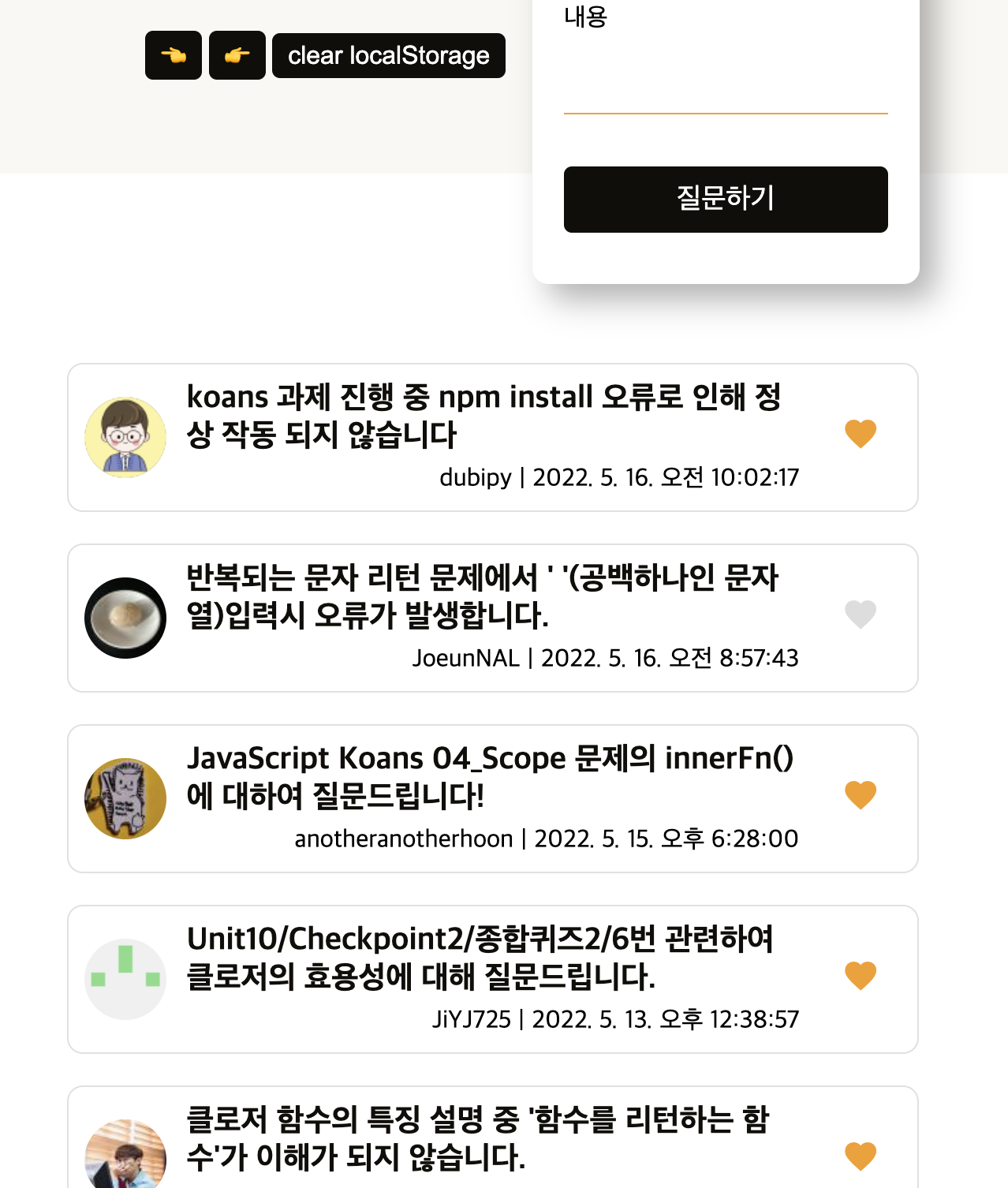 처음에는 fetch를 특정 변수에 담으려고 해서 제대로 구현되지 않았었다. 비동기와 Promise에 대한 이해가 부족했던것같다. 하지만 소그룹 회고를 하면서 다른 분들의 코드를 보고 고칠점을 떠올릴 수 있었다.