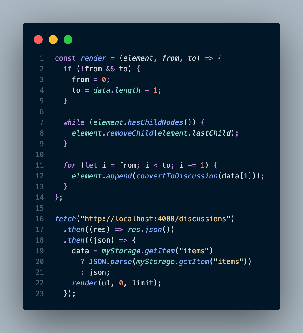 해당 코드는 로컬 스토리지에 데이터가 있다면 JSON.parse()로 로컬 스토리지의 데이터를 가져오고, 그렇지 않다면 서버로부터 가져온 데이터를 렌더링한다.