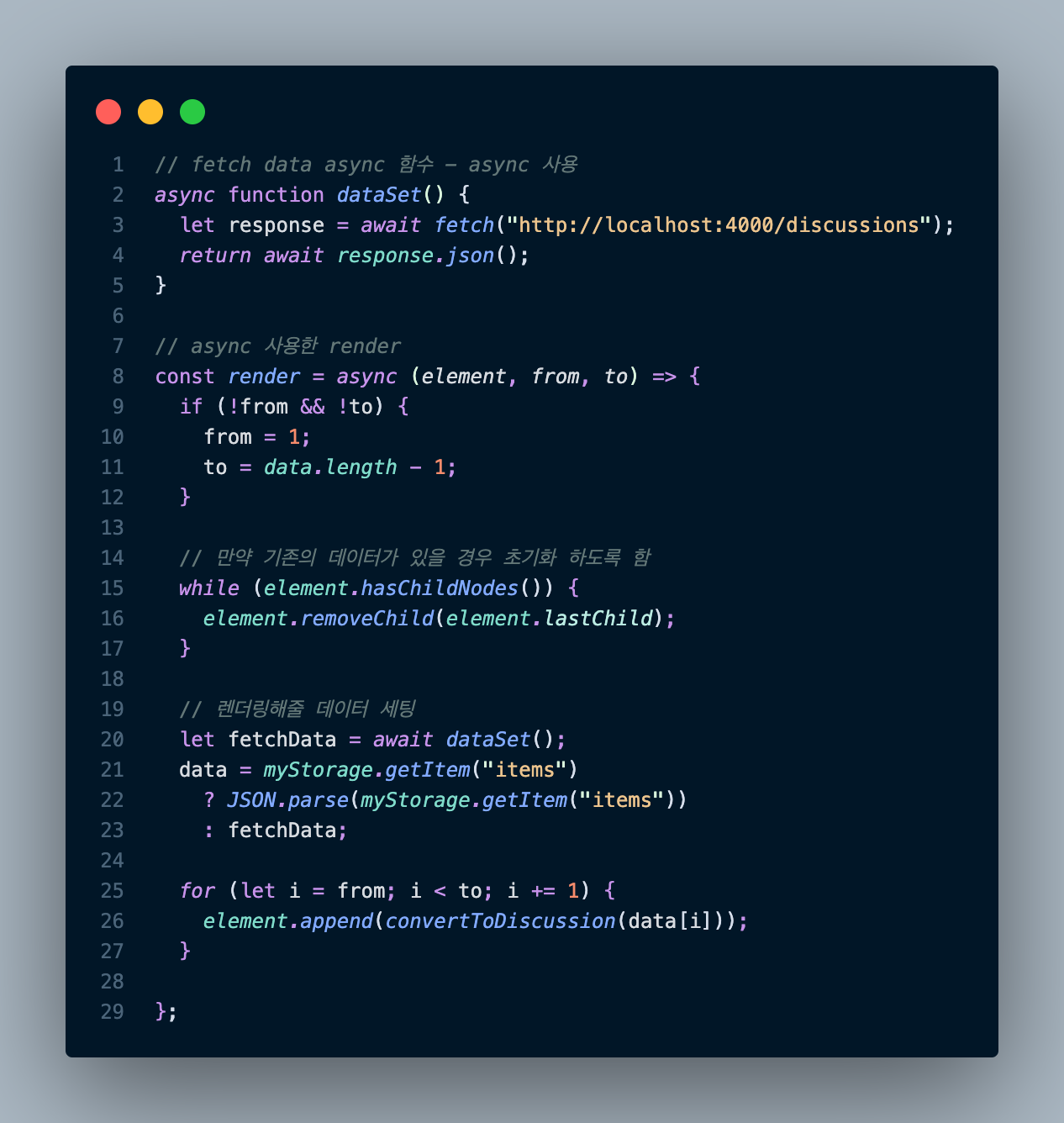 아래는 asnyc/await로 구현한 코드이다.