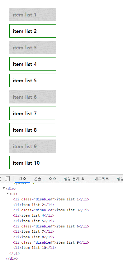 아래 이미지를 보면 요소들을 클릭했을때 disabled 클래스가 없는 li들에만 이벤트 핸들러가 실행됨을 알 수 있다.