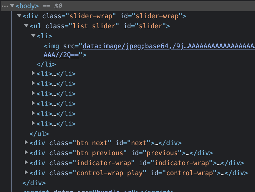 슬라이드의 모든 요소를 감싸고 있는 slider-wrap 안에 이미지 슬라이더와 다음, 이전 버튼, 인디케이터, 그리고 자동재생버튼이 들어있다.
