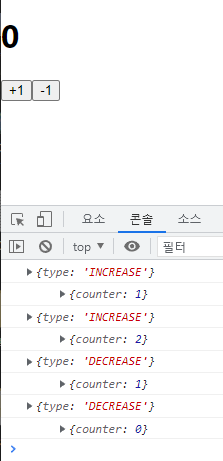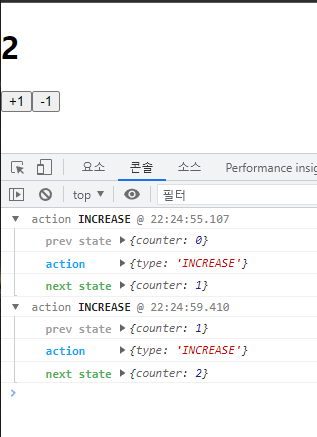 액션과 액션이 전달된 이후 스토어의 상태를 확인할 수 있다