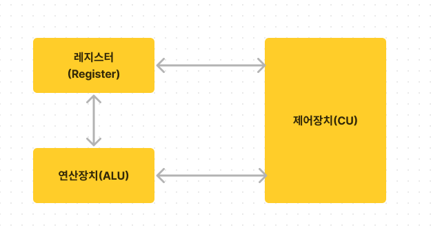- 산술/논리 연산장치(ALU), 제어장치, 레지스터로 구성됨