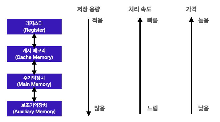 - 프로그램 수행을 위해 필요한 정보에 비해 CPU 내에 구비된 레지스터의 용량이 너무 작기때문