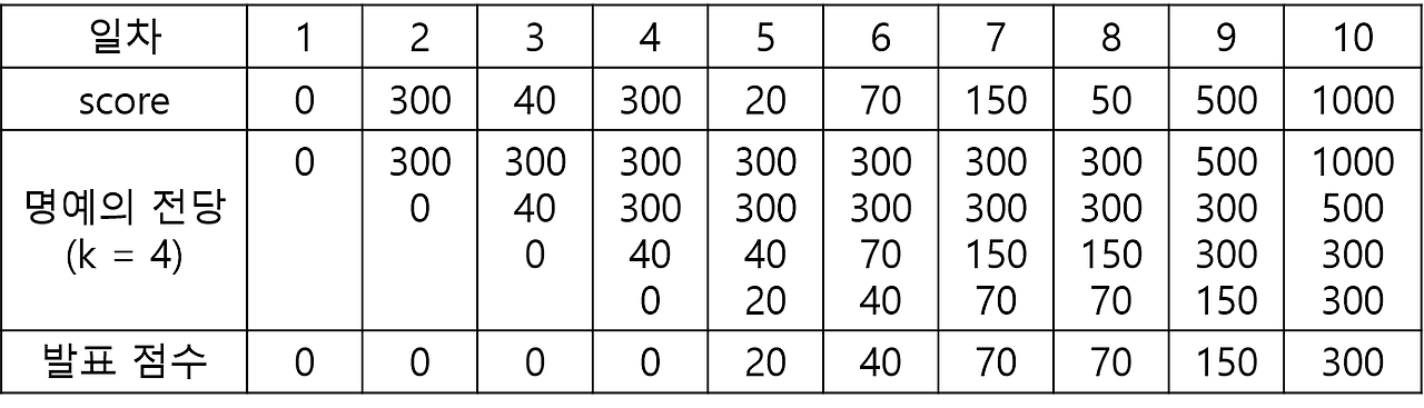 "명예의 전당"이라는 TV 프로그램에서는 매일 1명의 가수가 노래를 부르고, 시청자들의 문자 투표수로 가수에게 점수를 부여합니다. 매일 출연한 가수의 점수가 지금까지 출연 가수들의 점수 중 상위 k번째 이내이면 해당 가수의 점수를 명예의 전당이라는 목록에 올려 기념합니다. 즉 프로그램 시작 이후 초기에 k일까지는 모든 출연 가수의 점수가 명예의 전당에 오르게 됩니다. k일 다음부터는 출연 가수의 점수가 기존의 명예의 전당 목록의 k번째 순위의 가수 점수보다 더 높으면, 출연 가수의 점수가 명예의 전당에 오르게 되고 기존의 k번째 순위의 점수는 명예의 전당에서 내려오게 됩니다.