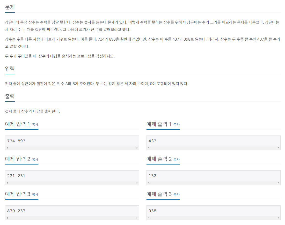 상근이의 동생 상수는 수학을 정말 못한다. 상수는 숫자를 읽는데 문제가 있다. 이렇게 수학을 못하는 상수를 위해서 상근이는 수의 크기를 비교하는 문제를 내주었다. 상근이는 세 자리 수 두
