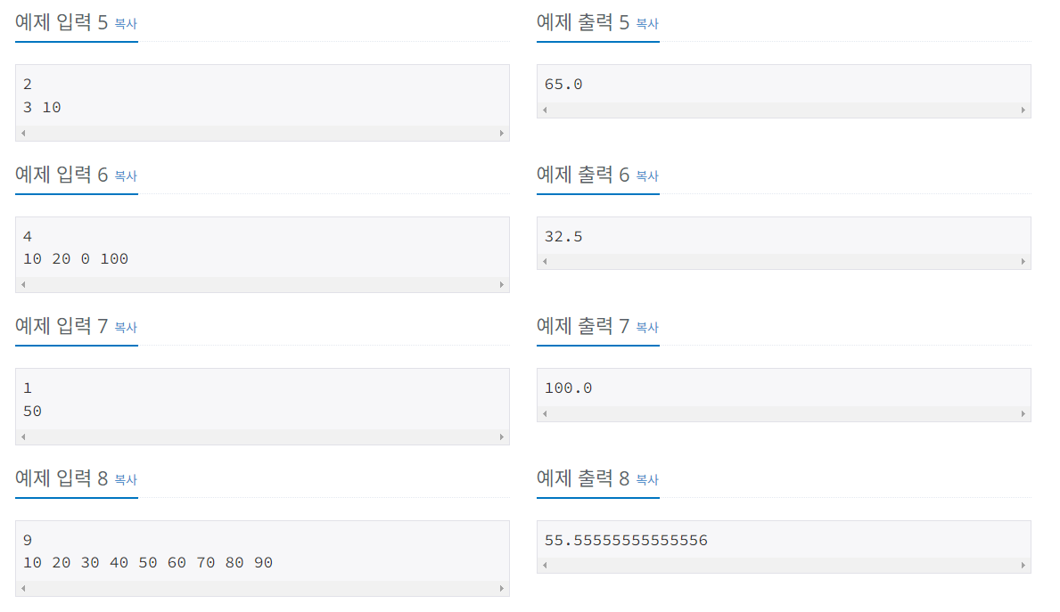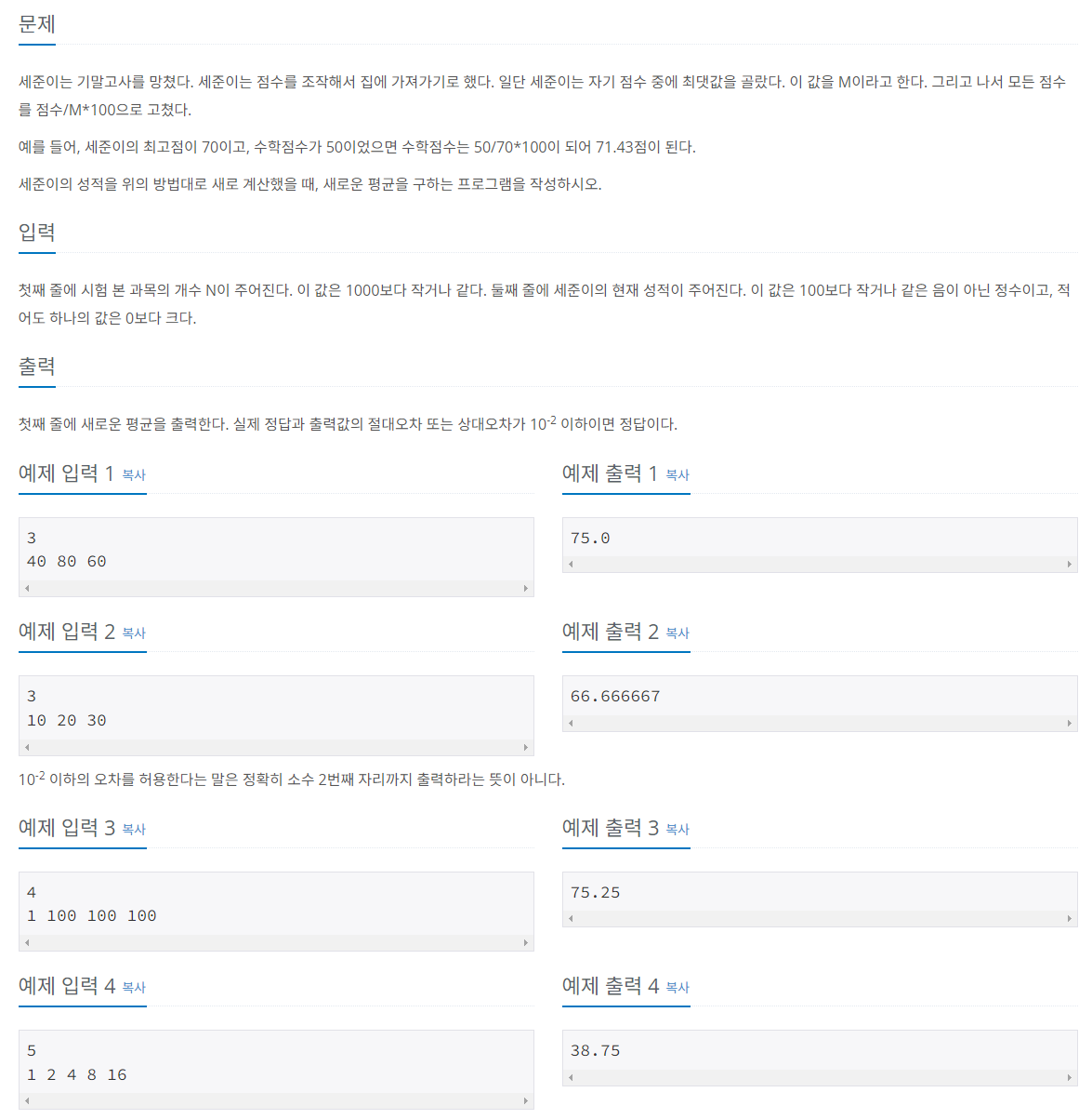 첫째 줄에 시험 본 과목의 개수 N이 주어진다. 이 값은 1000보다 작거나 같다. 둘째 줄에 세준이의 현재 성적이 주어진다. 이 값은 100보다 작거나 같은 음이 아닌 정수이고, 적어도 하나의 값은 0보