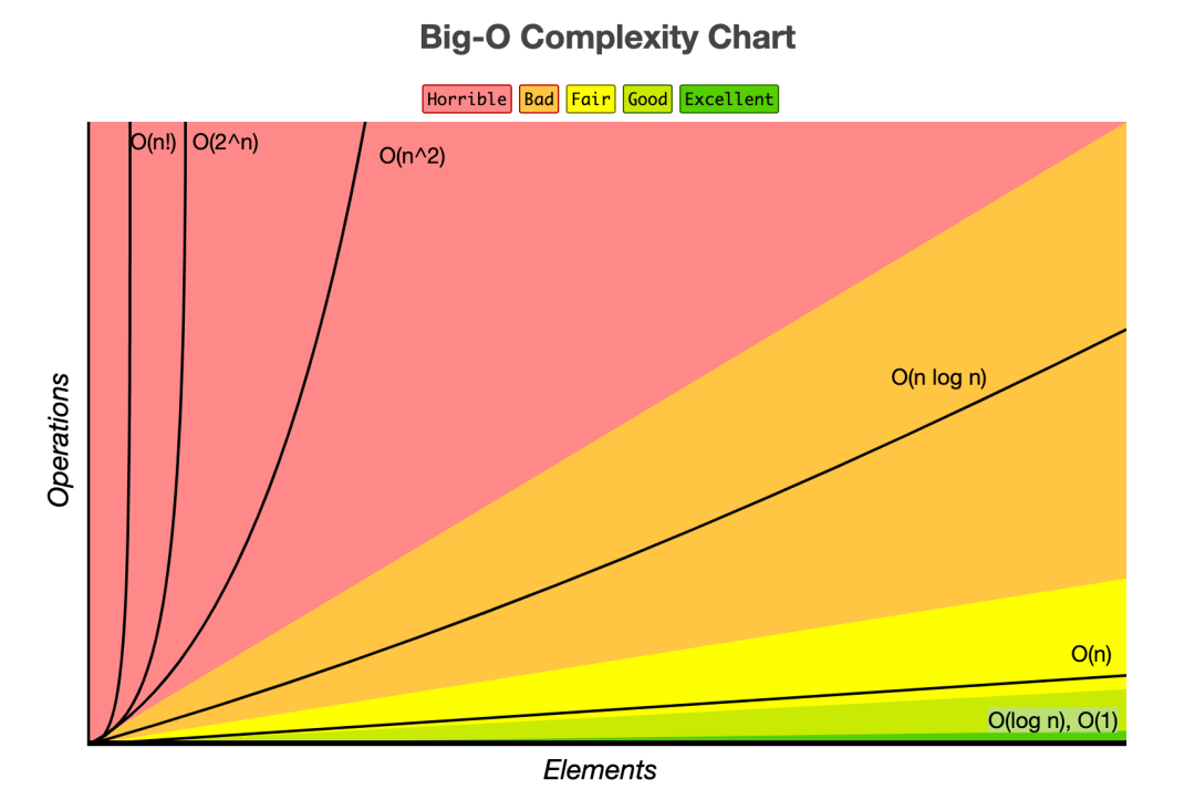 대표적인 빅오 표기법에는 O(1), O(log n), O(n), O(n log n), O(n^2), O(2^n), O(n!)이 있다.