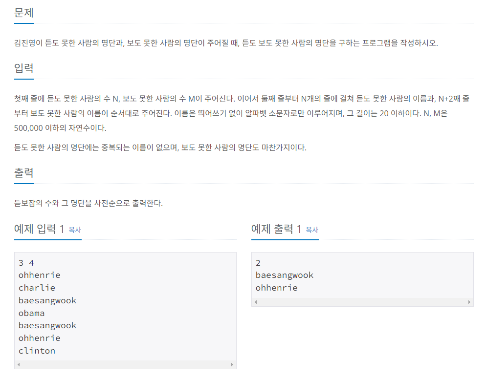첫째 줄에 듣도 못한 사람의 수 N, 보도 못한 사람의 수 M이 주어진다. 이어서 둘째 줄부터 N개의 줄에 걸쳐 듣도 못한 사람의 이름과, N+2째 줄부터 보도 못한 사람의 이름이 순서대로 주어진다.