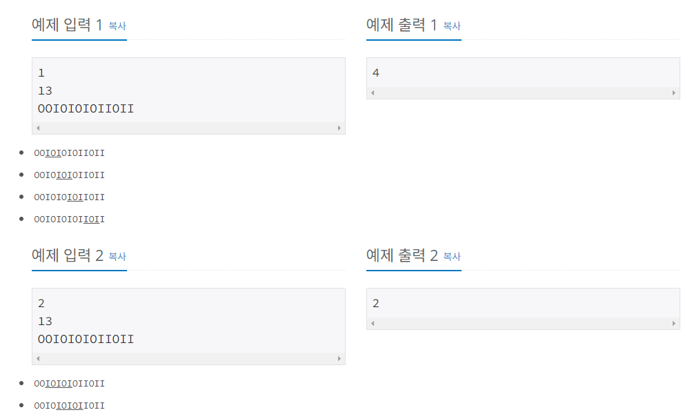 N+1개의 I와 N개의 O로 이루어져 있으면, I와 O이 교대로 나오는 문자열을 PN이라고 한다. P1 IOI P2 IOIOI P3 IOIOIOI PN IOIOI...OI (O가 N개) I와 O로만 이루어진 문자열 S와 정수 N이 주어졌을 때, S안에 PN이 몇