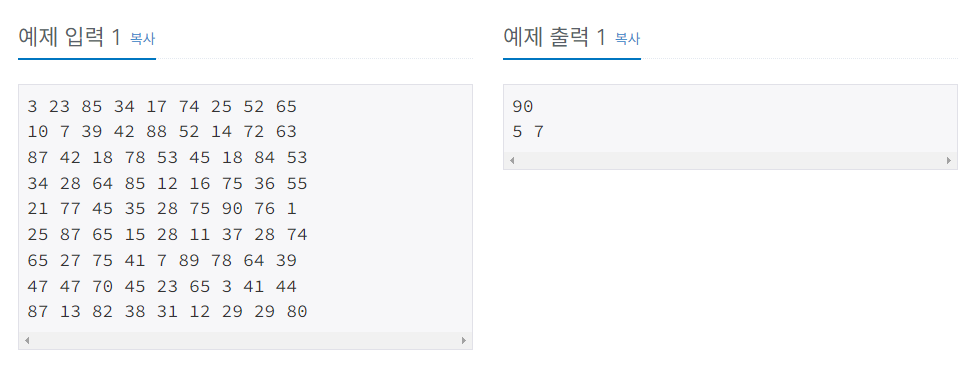 첫째 줄에 최댓값을 출력하고, 둘째 줄에 최댓값이 위치한 행 번호와 열 번호를 빈칸을 사이에 두고 차례로 출력한다. 최댓값이 두 개 이상인 경우 그 중 한 곳의 위치를 출력한다.