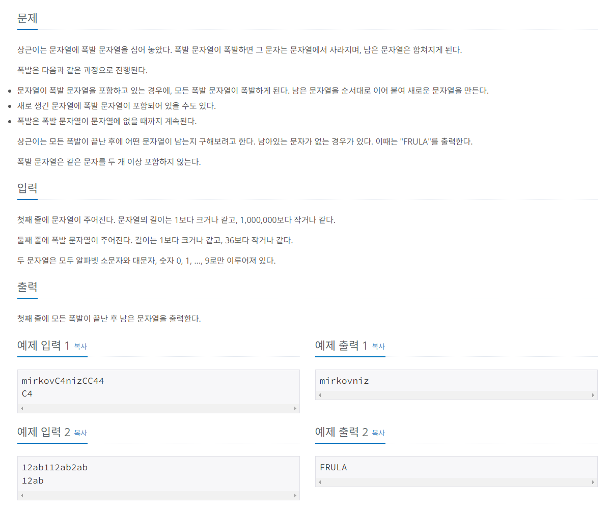 첫째 줄에 문자열이 주어진다. 문자열의 길이는 1보다 크거나 같고, 1,000,000보다 작거나 같다. 둘째 줄에 폭발 문자열이 주어진다. 길이는 1보다 크거나 같고, 36보다 작거나 같다. 두 문자열은 모