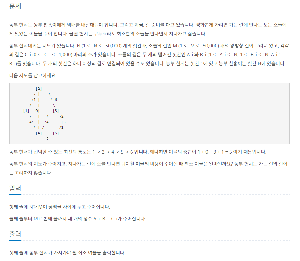 지도가 주어지고, 길을 지날때 소를 만나면 줘야하는 최소 여물은 얼마일까라는 부분에서 다익스트라 문제라는것을 추측할 수 있었다.