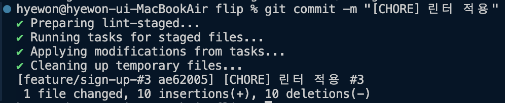 실제로 커밋을 해보면 아래처럼 린터와 포맷터가 적용되는걸 볼 수 있다.