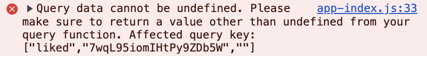 React-Query(Tanstack-Query)์์ useQuery๋ฅผ ์ฌ์ฉํ๋ฉด์ ๋ฌธ์ ๊ฐ ์๊ธด ๊ฒ ๊ฐ์๋ค. ๊ทธ๋์ ๋จผ์ ์ฝ์์ ๋ฌ ์๋ฌ ๋ด์ฉ์ ์ฝ์ด๋ณด์๋ค. ๋ด์ฉ์ ์์ฝํด๋ณด๋ฉด ์ฟผ๋ฆฌ ๋ฐ์ดํฐ๋ฅผ ์ฐพ์ ์ ์์ / undefined ๋ง๊ณ ๋ค๋ฅธ ๊ฐ์ ๋ฆฌํดํ๊ฒ ํด์ผํ๋ค / ๋ฌธ์ ๊ฐ ์๊ธด ์ฟผ๋ฆฌํค ์๋ค.