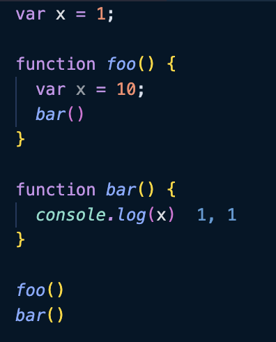 예시 코드를 보았을때, foo와 bar의 출력 결과를 먼저 생각해 보자. 언뜻 생각해보면 함수 foo가 실행되었을때, foo에는 지역변수 x가 있고 함수 bar가 실행되기때문에 출력되는것이 10이라고 생각할 수 있다. 하지만 함수의 스코프는 함수 정의가 실행될때 결정된다. 즉, 함수 bar는 전역에 정의되어있고, 자바스크립트는 렉시컬 스코프를 따르기 때문에 bar가 foo내에서 실행되더라도 상위 스코프에는 영향을 주지 않는다. 그래서 foo안에서 bar가 실행되든, bar가 그대로 실행되든 결과는 모두 똑같이 전역에 있는 x를 참조하여 1을 두번 출력하게 되는것이다.