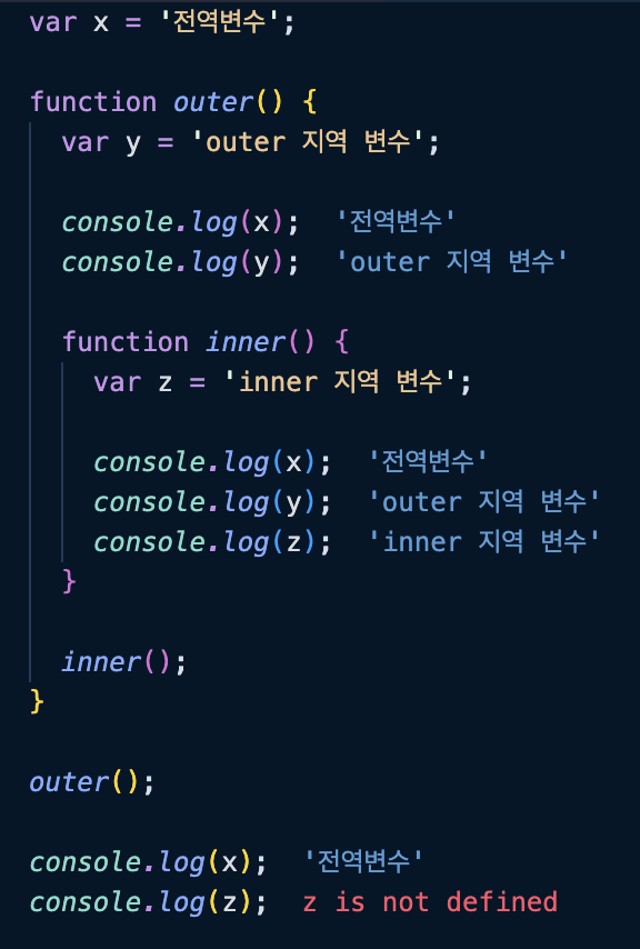 inner가 실행되었을때 console.log 중 두번째 코드가 실행될때, 출력하기 위해 변수 y를 찾을 것이다. 하지만 inner 내에 y라는 변수는 없다. 그래서 상위 스코프인 outer로 이동해 y를 찾는것이다. outer에는 변수 y가 있기때문에 참조하여 출력할수 있었던 것이다.